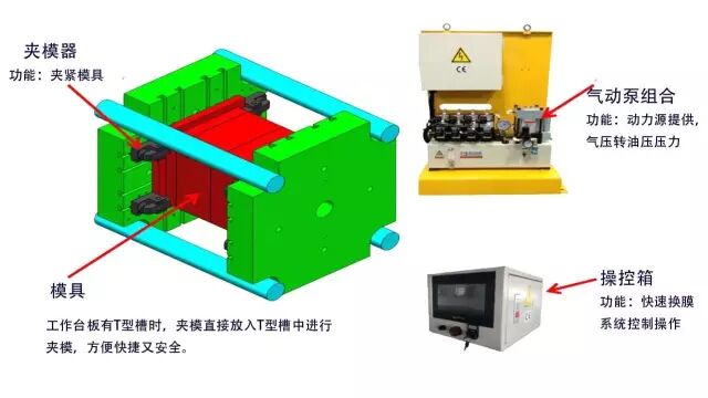 广州能之原科技股份有限公司旗下控股公司——广州快模科技有限公司,专注生产快速换模系统,此系统包含夹模器、气动泵组合、操控箱。使用本产品换模时间可节约90%以上;能满足所有品种,少批量生产需要,减少库存,产品和资金积压,提高产销速度和资金回转。